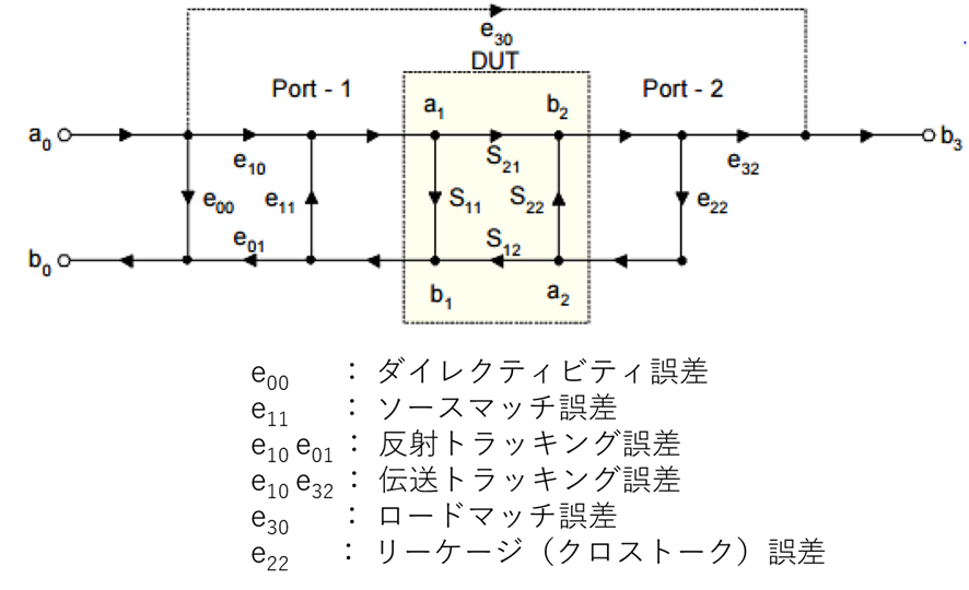 そしてキャリブレーションとは、上図の12個の誤差項の値を正確に決定する作業にほかなりません。ここでは各誤差項の意味を簡単に紹介します。なお逆方向(ポート2からの信号)の測定においても同様の6つの誤差項が存在し、これらを合わせて合計12個となります。