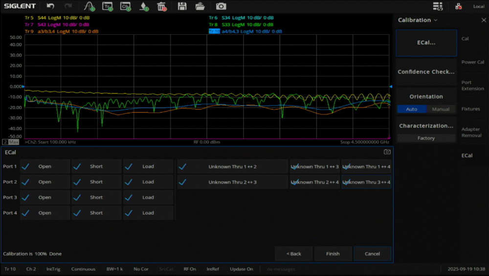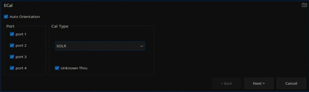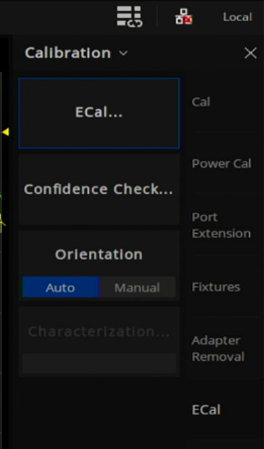 「ECal...」から校正作業を進めることができます。「Confidence Check...」ではE-Cal本体の情報を確認できます。「Orientation」はVNAとE-Calの接続関係を設定するもので、AutoとManualを選択できます。Autoを選択することで、VNAのポート(1~4)とE-Calのポート(A~D)の接続関係を自動で判別してくれるため、基本的にはAutoのままで問題ありません。