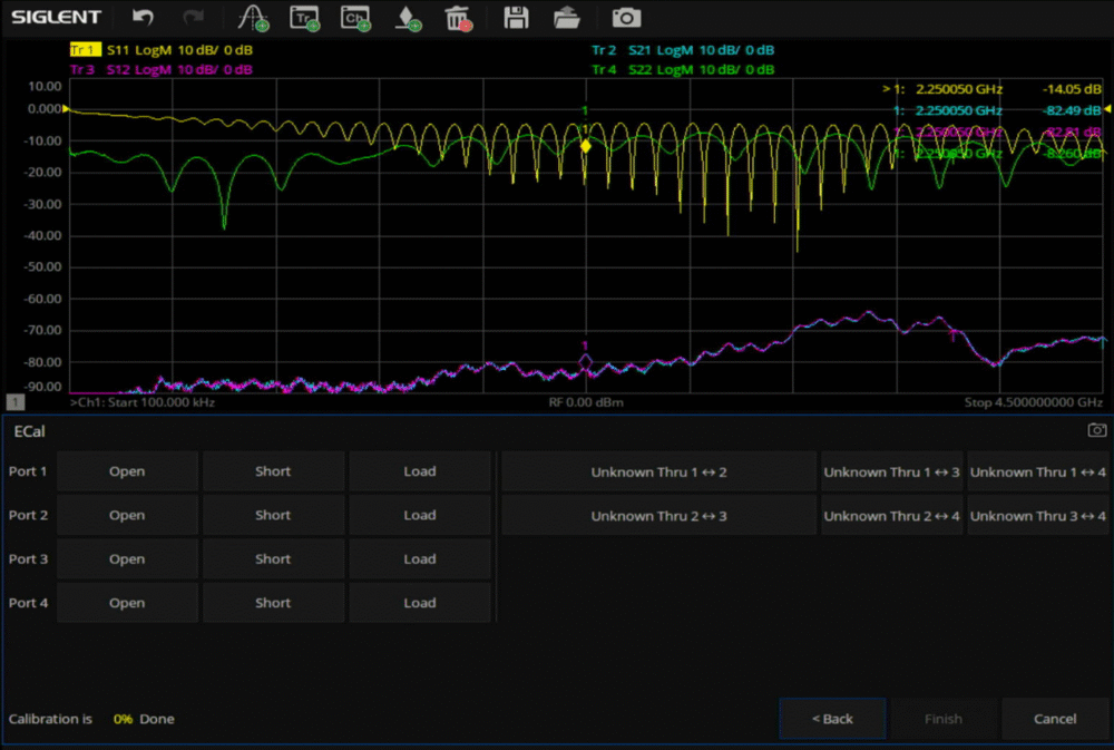 Open、Short、Load、Thruの各標準器を順番に切り替えて測定を繰り返すと、未知数である12個の誤差項に対して、十分な数の方程式が成り立ちます。VNAの内部プロセッサは、この複雑な連立方程式を数学的に解くことで、12個すべての誤差項の値を周波数ごとに算出します。