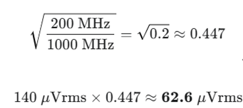200MHzの帯域制限を掛けるとノイズレベルは70μVrms程度まで低下します。