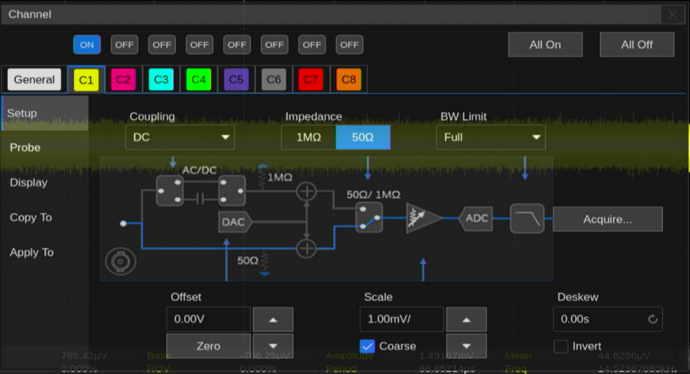 なおSDS5108X HDは入力インピーダンスを1MΩと50Ωから選択でき、今回はインピーダンス整合を考慮して50Ω入力での結果を示します。