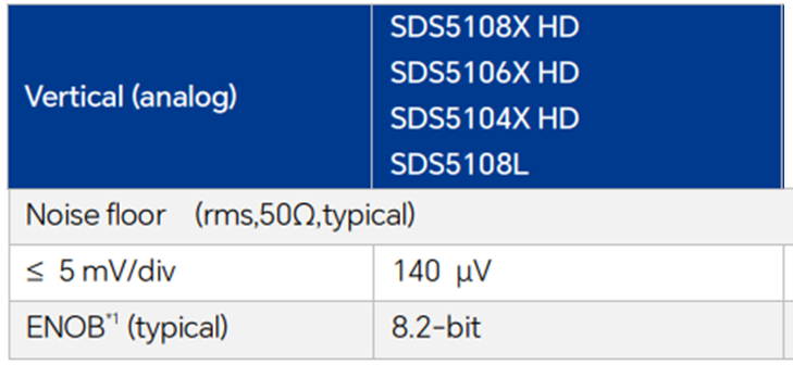 データシートでは入力電圧範囲が5mV/div以下の条件、かつ50Ω入力での実効電圧rmsが Noise Floorの特性値として記載されており、SDS5108X HDは140μVとなっています。