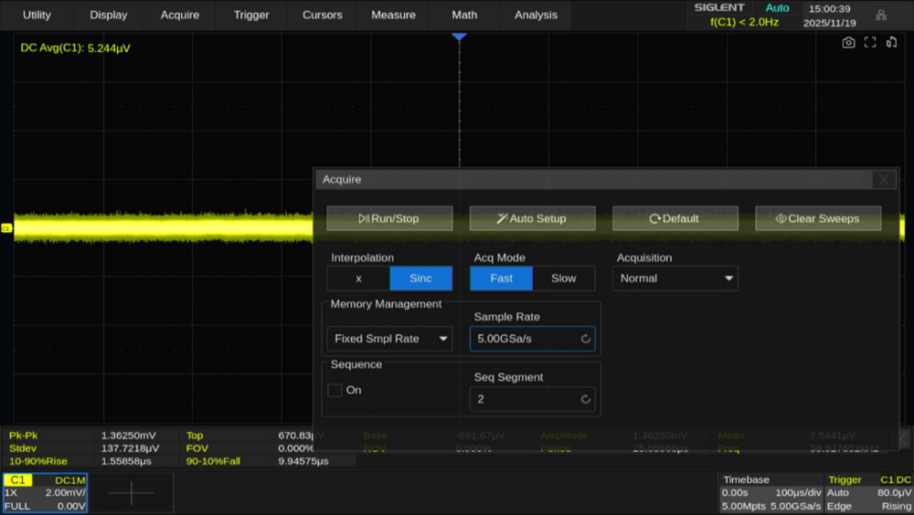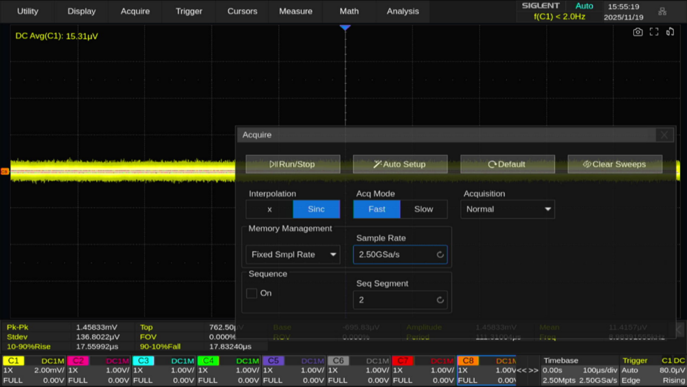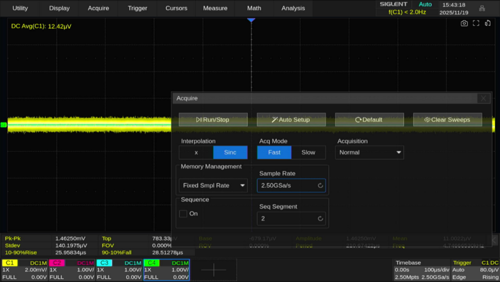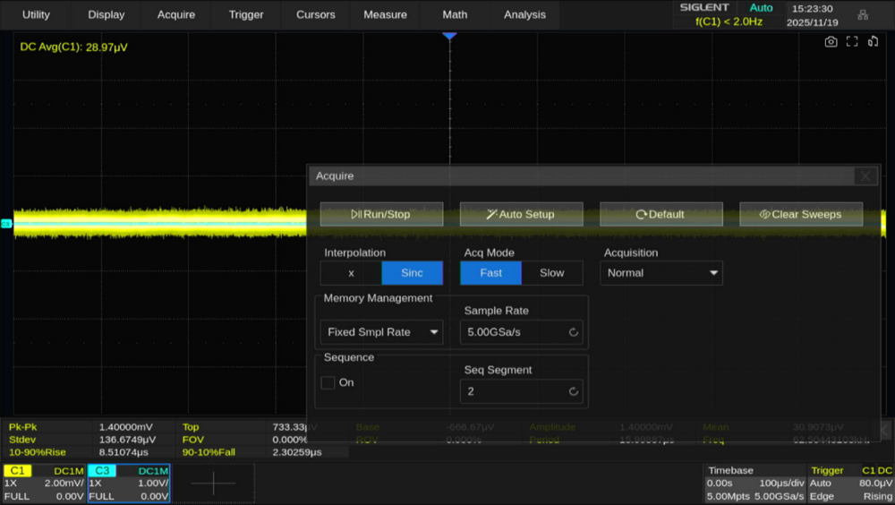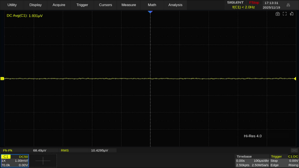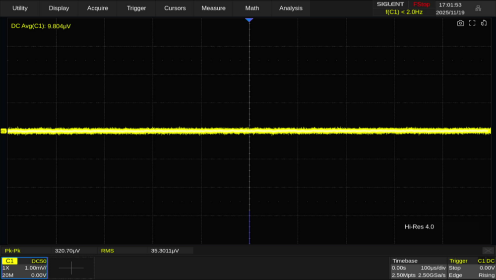 またハイレゾモード使用時は、ベースのサンプリングレートをあえて低くすることでノイズレベルを下げる方法もあります。ここではサンプリングレートを 2.5GSa/s → 2.5MSa/sまで低下させると、ノイズレベルが10μVrmsまで低下しています。
