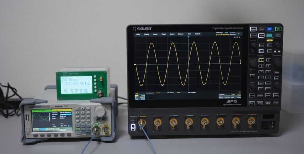 周波数帯域の確認方法としては、SDS5108X HDのチャネル1を50Ω入力とした状態で、信号発生器から0dBmの正弦波を出力して波形を測定します。