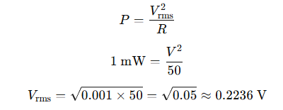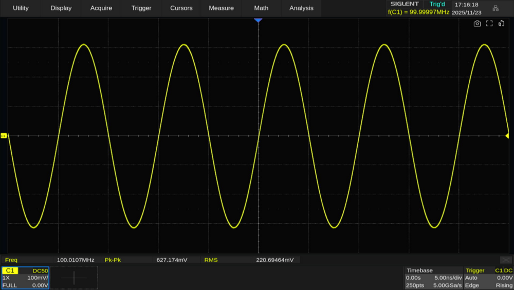 Measurement機能によると周波数は100MHzで、ピークツーピークが627mVpk-pk、実効値が220mVrmsとなっています。50Ω系のシステムで0dBmの実効値は以下のように計算できます。
