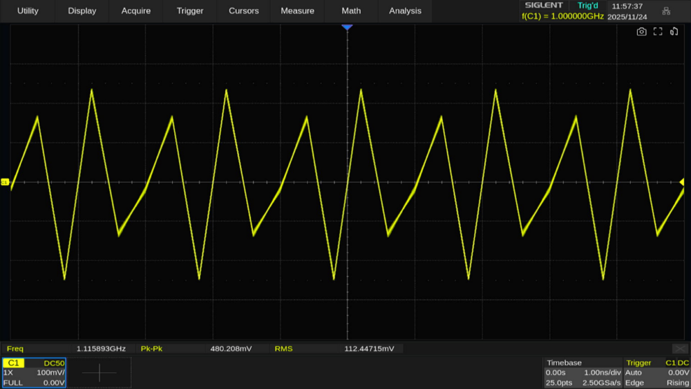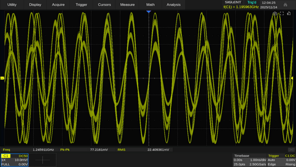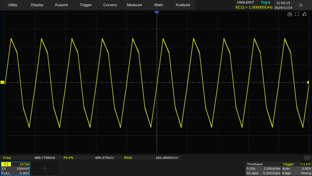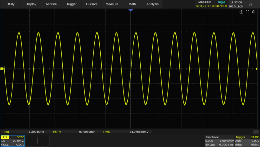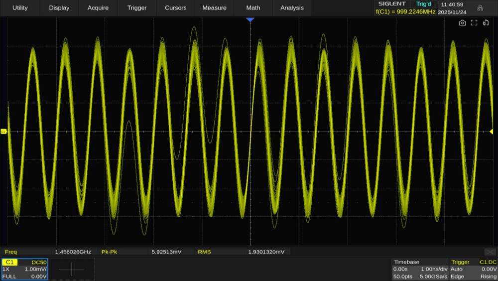 1GHzの正弦波に対してはエイリアシングが関係ないため、安定して波形を表示できます。ただしサンプリングレートが低下することでサンプルポイントが減少し、それによって補間(Interpolation)の程度が変化するため電圧が若干低下しています。