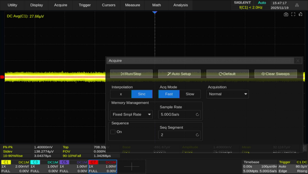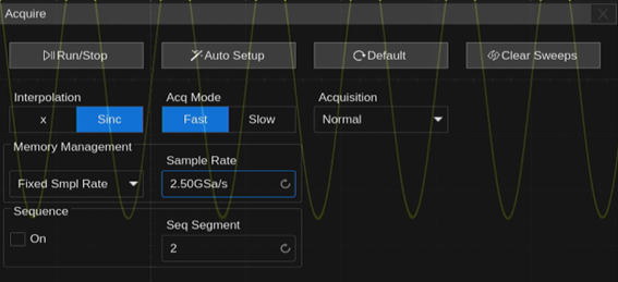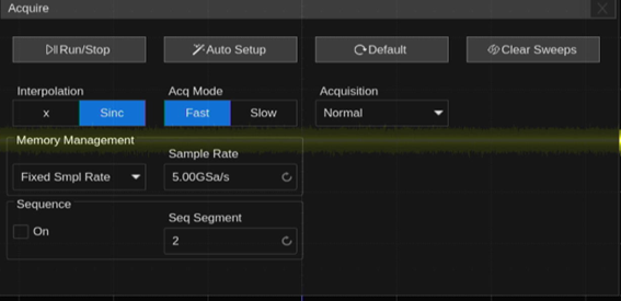 上図においては Sample Rateが5GSa/sとなっており、最大サンプリングレートの条件で動作していることがわかります。