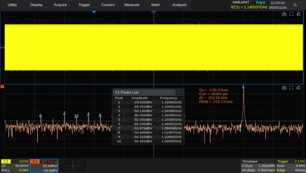 実測値と計算値を比較すると、実測値のほうがやや電圧が高くなっています。これは信号発生器の出力レベルが適切に調整されていない測定システムが原因で、SDS5108X HDは1GHzの信号も十分測定できていると言えます。