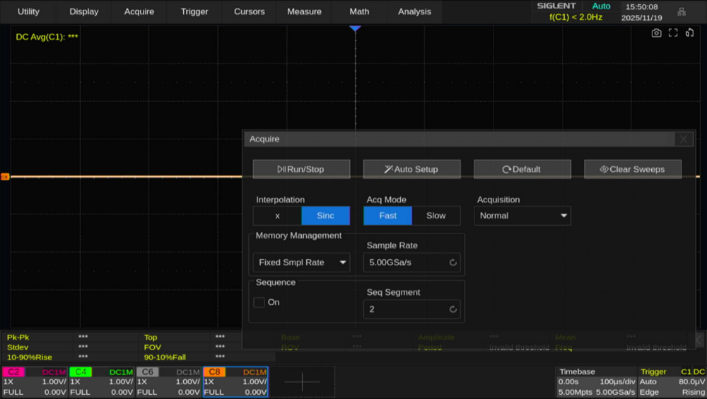 まずは1CHだけ動作させたときのサンプリングレートです。SDS5108X HDは全8CHあるため、各CHを単独動作させてサンプリングレートを確認しました。結果としては、すべてのCHで単独動作時に 5GSa/sで動作しました。