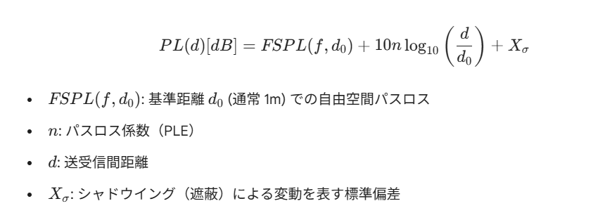 理論上の自由空間におけるパスロス係数は n = 2.0 ですが、実環境(屋内など)では周囲の反射や減衰の影響でこの値が変動します。