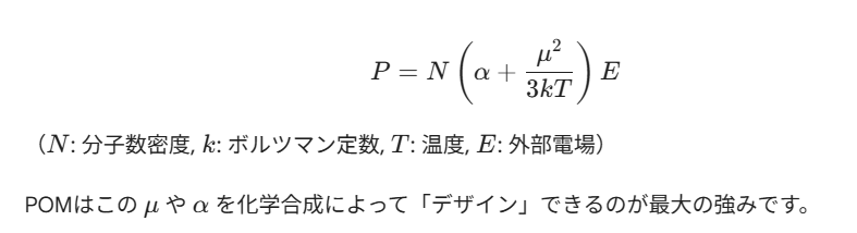 POMの誘電特性を数式で考える場合、分子の分極率α や、配向分極に寄与する双極子モーメント μ が重要になります。全分極 P は概ね以下の関係で表されます。