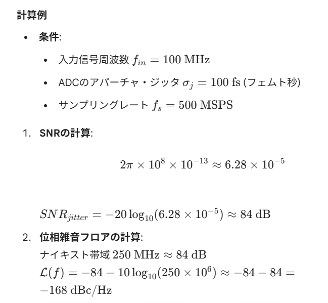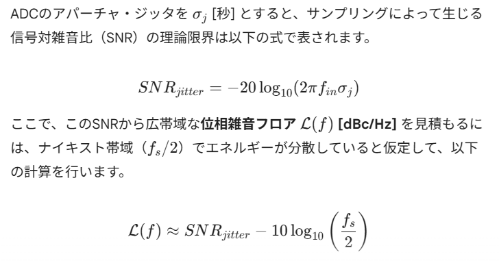 全ディジタル位相雑音計測において、ADCの**アパーチャ・ジッタ(Aperture Jitter)**は、アナログ方式における「LO(局発)の位相雑音」に相当する、最も支配的なノイズ源となります。
