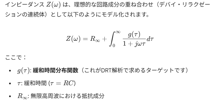 DRT法(Distribution of Relaxation Times)は、全固体電池のインピーダンス解析において「重なった円弧を分離する」ための強力な数学的ツールです。