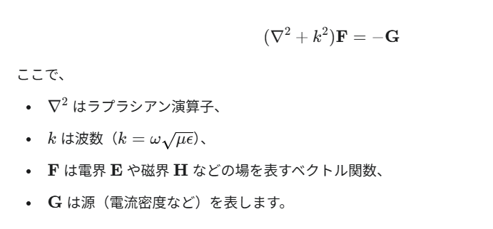 電磁気学において、時間的に正弦波状に変動する電磁界(時間高調波、または周波数領域の電磁界)は、一般的にヘルムホルツ方程式によって記述されます。