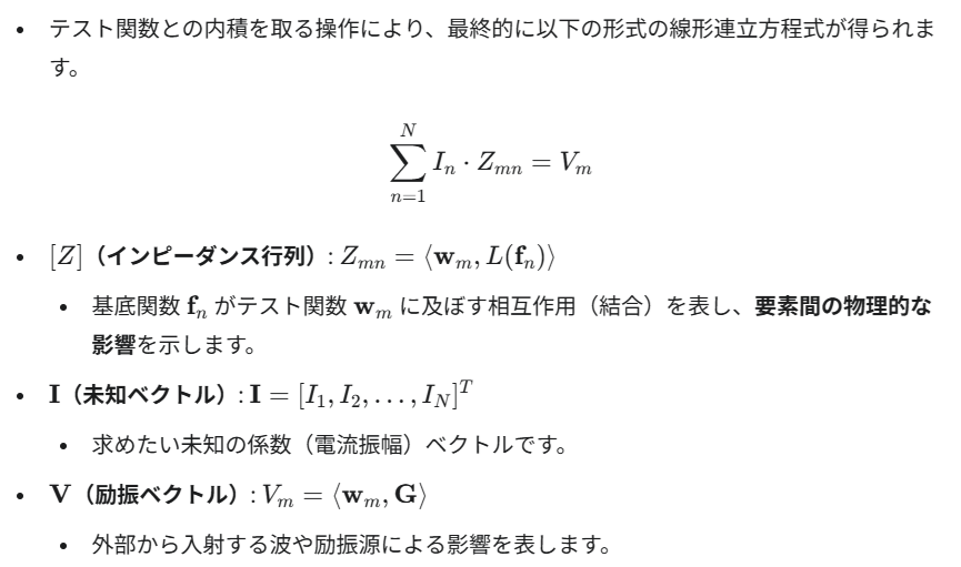 求めたIを基底関数の展開式に戻すことで、元の未知関数(電流分布など)が得られます。