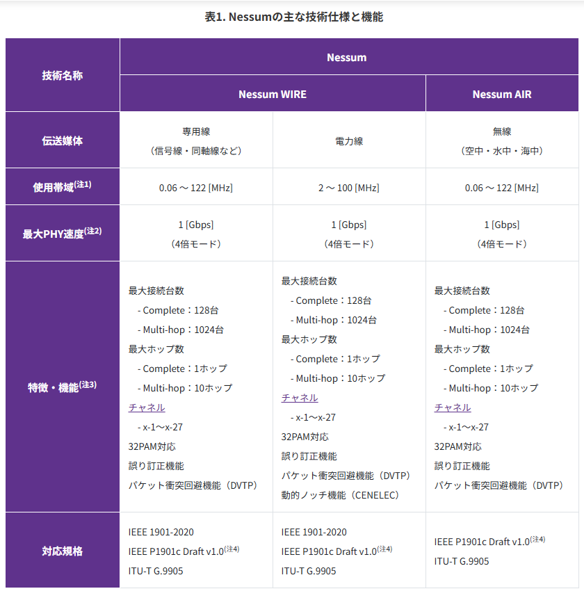 Nessumの主な技術仕様と機能 ... Nessumは、有線・無線や水中などさまざまな通信媒体(Any Media)において、長距離有線通信や近距離高速無線通信を可能とする技術です。