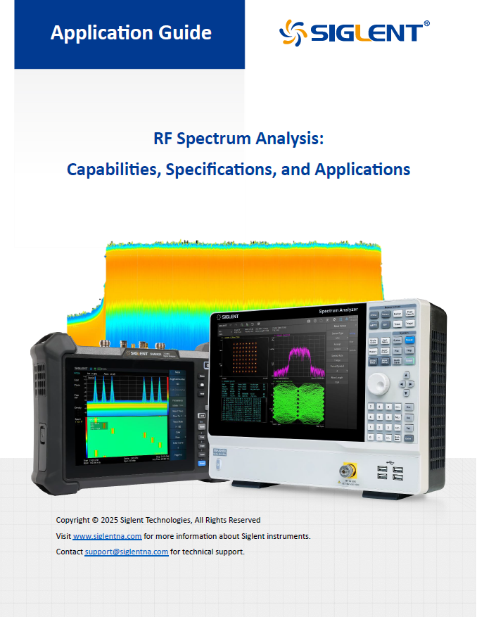Download the complete signal analysis guide to learn settings and use cases for signal and spectrum analyzers. Test complex signals, characterize RF devices, and debug enclosures and environments with Siglent's RF solutions. This spectrum analysis guide includes: key specifications, EMI tips & tricks, demodulation tools, and advanced measurements.