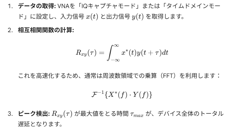 VNA(ベクトルネットワークアナライザ)を用いた測定において、特に再生型衛星ペイロードやRFSoC(AMD Zynq UltraScale+等)のような**「入力と出力でサンプリングクロックが独立している(非コヒーレントな)デバイス」**の遅延を評価する場合、従来の位相傾斜法(Phase Slope)に代わり、相互相関(Cross-Correlation)法による時間領域解析が非常に有効です。
