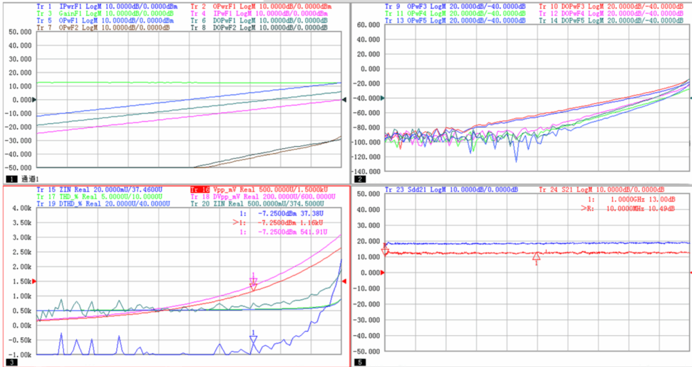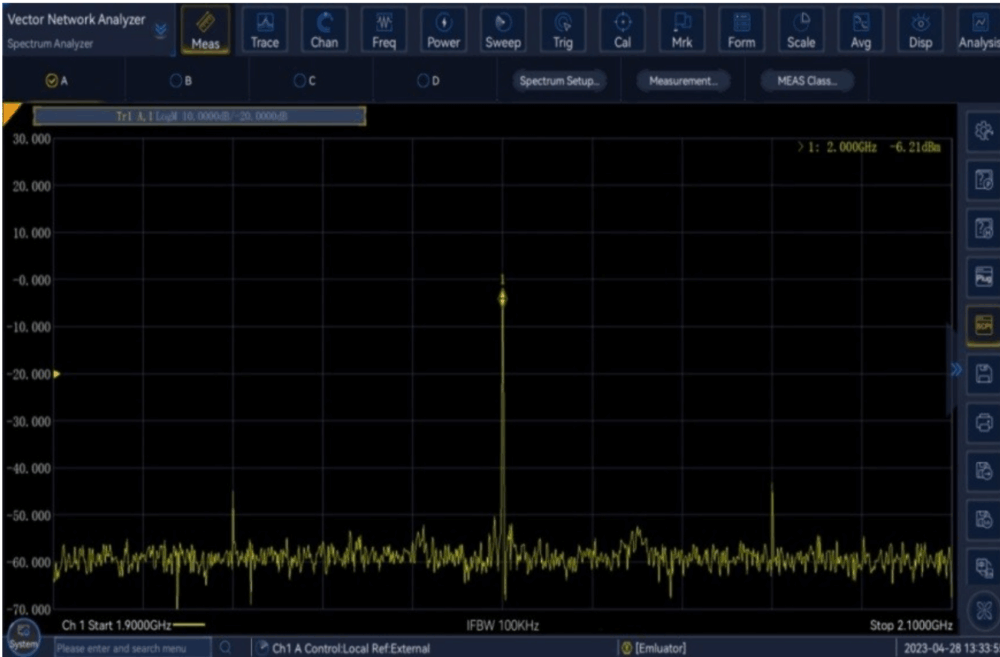 マルチポートの不要輻射および高調波を高速に探索可能で、ベクトルネットワークアナライザ各ポートで被測定デバイスの入力・出力スペクトラム測定に対応します。高速フーリエ変換(FFT)技術に基づくスペクトラム解析により、小さなRBW設定でも不要輻射および高調波の状態を迅速に特定できます。アクティブデバイス試験では、1台・1回の接続でSパラメータ測定、不要輻射・高調波測定など複数パラメータを同時評価可能で、比対および絶対誤差補正技術により測定精度をさらに向上します。また、バンド内電力、電力スペクトル密度、占有帯域幅、隣接チャネル漏洩電力比などの指標をマーキング機能で即時に算出し、ワンクリック設定とリアルタイム更新によって効率的な評価を実現します。