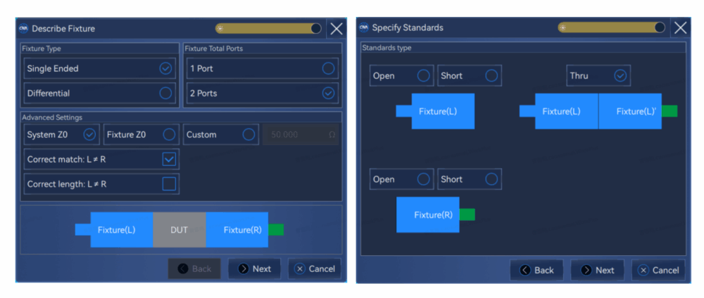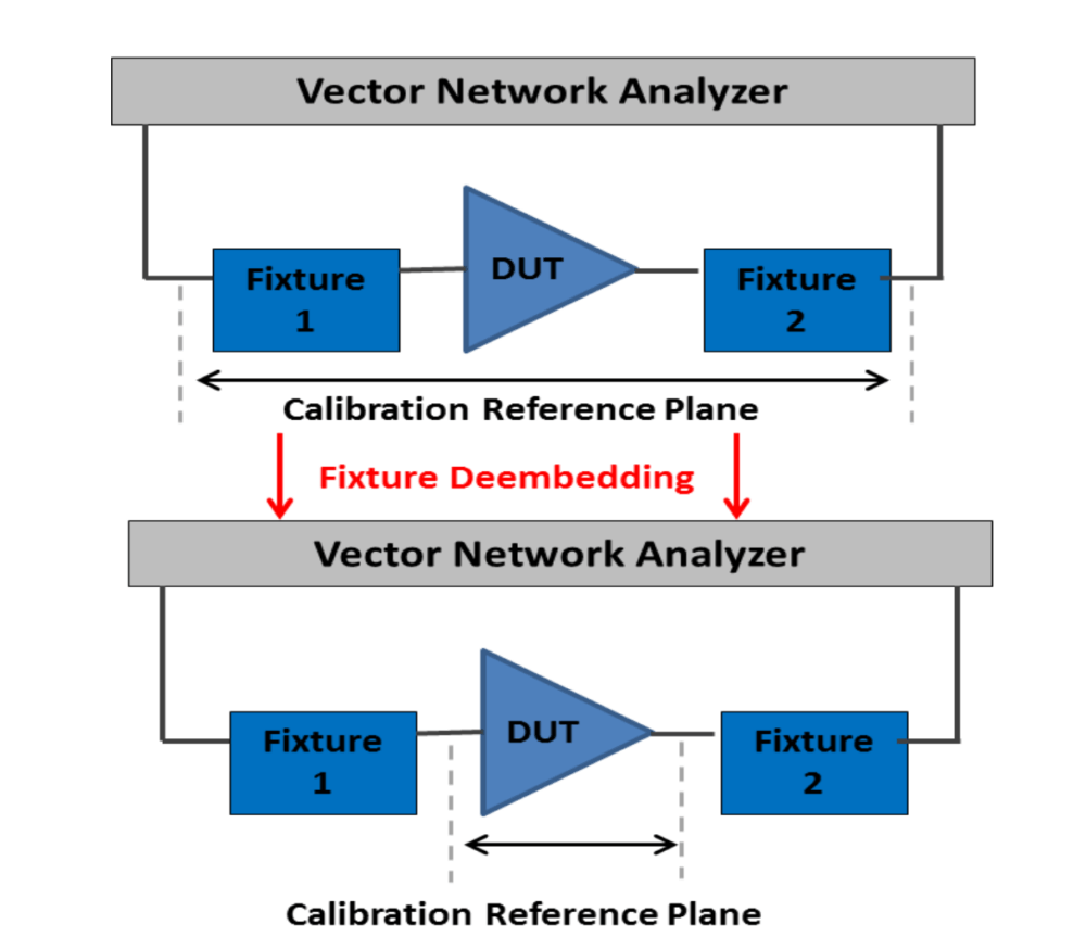 パッケージ化マイクロ波デバイスやオンチップデバイスなど、ベクトルネットワークアナライザへ直接接続できない非標準コネクタデバイスの測定課題を解決します。通常は治具(フィクスチャ)を介して接続する必要がありますが、フィクスチャ自体が測定誤差を生じさせる場合があります。本機能ではフィクスチャのパラメータを抽出・保存し、デエンベッド処理を自動適用することで、被試験デバイス本来の特性を高精度に取得できます。