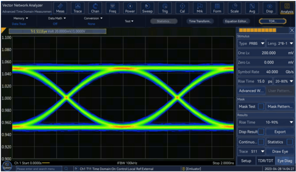 超広帯域カバレッジによりマイクロンスケールの時間領域解析が可能で、小型チップパッケージの試験における不連続点の位置特定課題を解決します。単一ビュー内で時間領域・周波数領域解析を同時に実行でき、インピーダンス不連続、反射、クロストークの発生源を迅速に特定可能です。伝送線路のインピーダンス特性を高精度に測定でき、近端/遠端クロストーク測定により複数伝送線路間の影響評価も容易です。また、ネットワークパラメータに基づく仮想アイダイアグラム生成と解析機能を搭載しており、高速デジタル通信規格に応じたアイマップテンプレートを用いた効率的な合否判定を実現します。ジッタ、ノイズなどの干渉条件を加えたシミュレーションが行え、プリエンファシスやイコライゼーションなどの補正アルゴリズム適用により、高速リンク内の任意位置におけるアイパターンを評価できます。