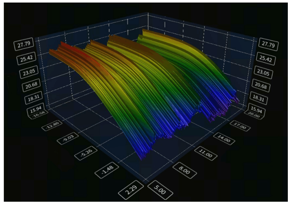1回の接続とキャリブレーションで、アクティブデバイスの線形利得、圧縮点における利得、入力電力・出力電力、線形入力マッチングなどの利得圧縮パラメータを迅速に測定できます。さらに、3Dビュー機能により、励起状態における被測定デバイスの特性を立体的に表示でき、周波数プロファイルやパワープロファイルを視覚化することで、各周波数点・各電力点での特性を直感的に把握でき、デバイス性能の理解がより容易になります。