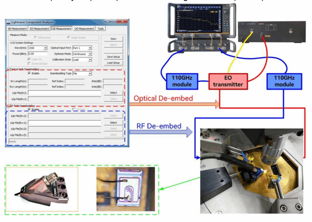 6433P光波コンポーネントアナライザは、プローブステーションおよび高周波プローブとの組み合わせにより、電気光/光電チップの周波数応答パラメータ測定を実現します。