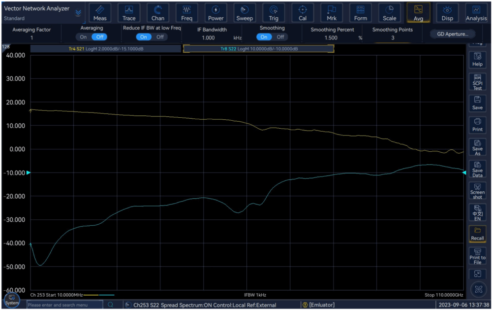 光電デバイス(フォトディテクタ、ROSA、TIA内蔵モジュールなど)のS22およびS21測定では、カーソル機能を使用して3dB帯域を素早く解析し、周波数応答特性を評価可能です。