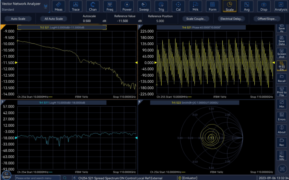 電気光変調器や直接変調レーザなどの電気光デバイスにおけるS11およびS21パラメータ測定では、マルチウィンドウ表示により周波数ごとの反射および透過特性を迅速に取得できます。